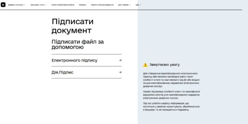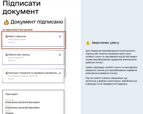 Підписану анкету зісканувати/зфотографувати і перейти за посиланням https://ca.diia.gov.ua/sign. Вхід в систему “Дія Підпис Документу” непотрібен.